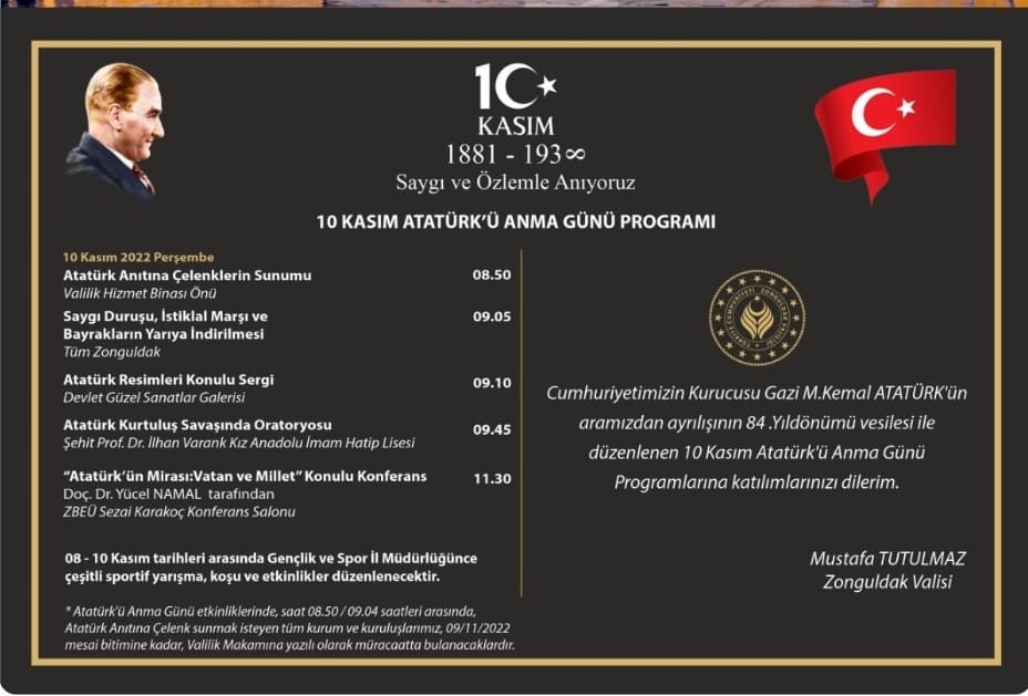 Türkiye Cumhuriyeti'nin kurucusu ulu önder Gazi Mustafa Kemal Atatürk'ün ölüm yıldönümü için hazırlanan tören programı açıklandı.