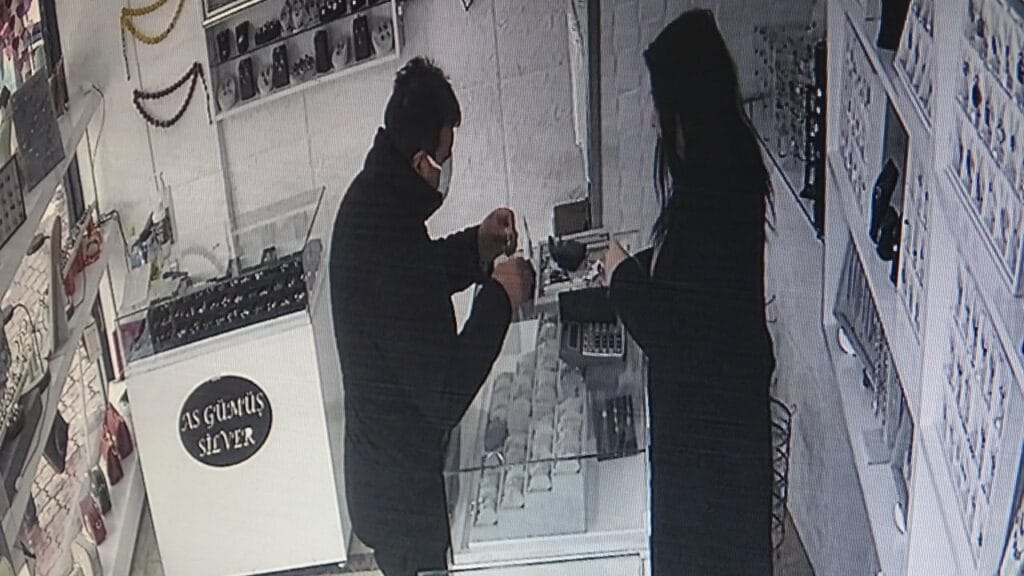 Dükkan sahibi Semra As, şüphelinin dükkana müşteri gibi girdiğini belirterek, “Bakıyor, inceliyor. Parmağına yüzükler takıyor. Ağır gramlı ürünleri seçiyor. 3 bin 500 liralık bir ürün beğeniyor. ‘Yan taraftaki lokantada bekleyen oğluma hemen gösterip geleceğim’ diyor. Lokanta tanıdığımız, bildiğimiz bir yer. Aradan bir kaç saat geçtikten sonra dükkana halen daha gelmedi. Lokantada öyle birinin olmadığı söylendi. Adam 3 bin 500 liralık ürünleri alıp gitmiş” dedi.