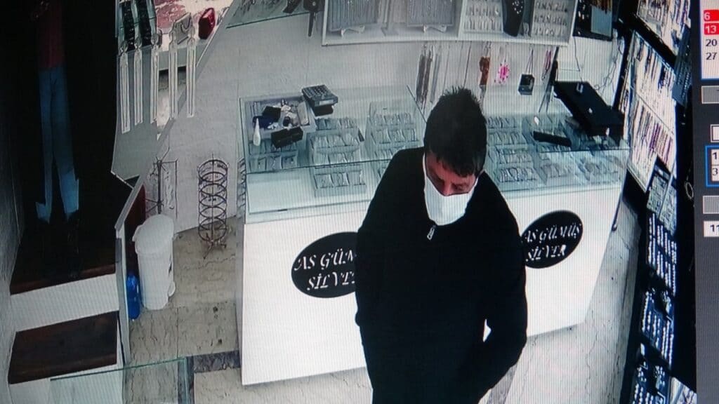 Olay, ilçe merkezindeki bir gümüş takı dükkanında meydana geldi. Cerrahi maskeli bir kişi, müşteri gibi girdiği dükkanda 3 bin 500 lira değerinde gümüş takı beğendi. Çalışana, bitişikteki lokantadan geldiğini söyleyen şahıs, 10 yaşındaki oğluna gösterip geri geleceğini söyledi. Dışarıya çıkan şüpheli geri gelmeyince lokantaya bakan çalışan şahsın gümüşlerle kayıplara karıştığını fark edince durumu polise ve dükkan sahibine bildirdi. Polis, güvenlik kamerasına yansıyan hırsızlık şüphelisini yakalamak için çalışma başlattı.