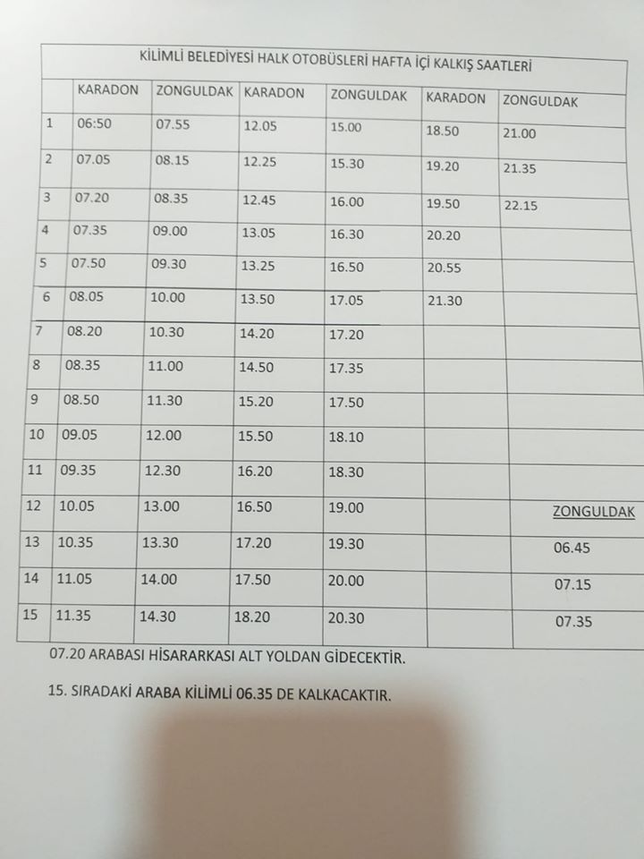 İşte yeni düzenleme ile Kilimli Özel Halk Otobüslerinin hareket saatleri ;