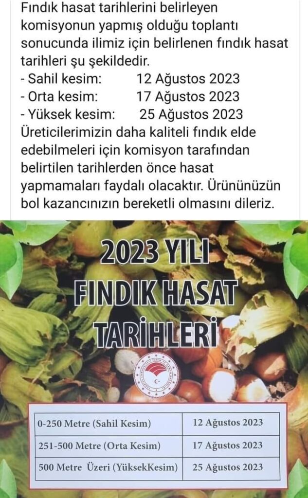 "Üreticilerimizin daha kaliteli fındık elde edebilmeleri için komisyon tarafından belirtilen tarihlerden önce hasat yapmamaları faydalı olacaktır. Ürününüzün bol kazancınızın bereketli olmasını dileriz." ifadelerine yer verildi.