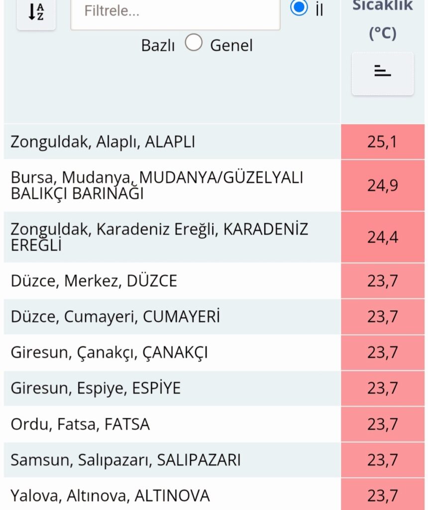 Meteoroloji Genel Müdürlüğü (MGM) kayıtlarına göre, 19 Ocak Perşembe, ülkenin en sıcak yeri 25°C ile Alaplı ilçesi olurken, Bursa'nın Mudanya ilçesi ise 24,9 dereceyle ikinci sırada yer aldı. Ereğli ise 24°C ile üçüncü sırada yer aldı.
