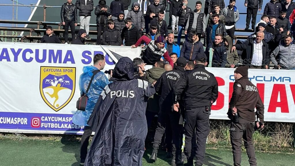 Zonguldak Deplasmanlı Süper Amatör Lig play-off turunda oynanan Çaycumaspor-Gelikspor maçı dostlukla başladı kavgayla son buldu.