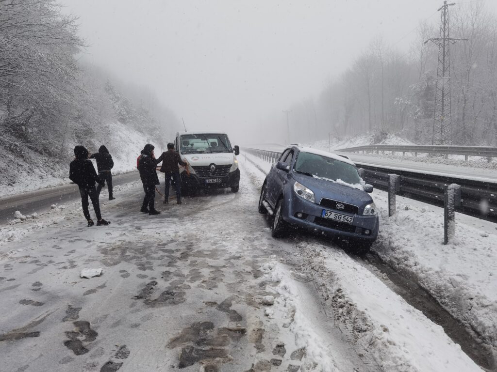Zonguldak’ta aniden bastıran kar yağışı nedeniyle Zonguldak Ereğli karayolunda etkili oldu yoğun kar yağışında sürücüler zor anlar yaşadı. Meteoroloji Genel Müdürlüğü'nün yoğun kar yağışı uyarısı sonrası kentte aniden bastıran kar yağışı kısa sürede etkili etkisini gösterdi. Zonguldak-İstanbul karayolunda sürücüler yoğun kar yağışı nedeniyle dikkatli seyir etti. Uzun araçlar ve zincirsiz araçlar yollarda kaldı. Karayolları ekipleri yollarda kar küreme işlemi yaptı. Yoğun kar yağışı nedeniyle Ereğli yolunda tırlar yolda kalırken yolda yoğun kar yağışı nedeniyle maddi hasarlı kazalar meydana geldi.