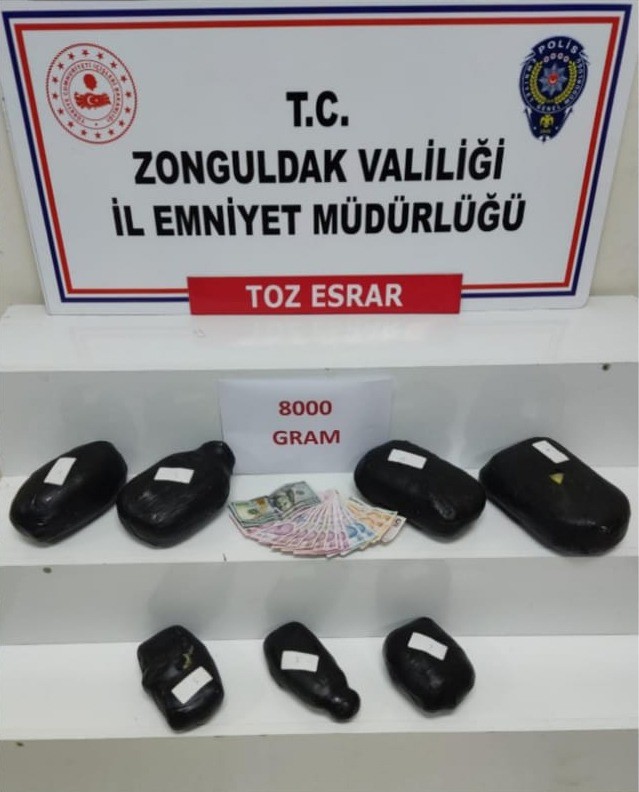 Edinilen bilgiye göre Zonguldak il Emniyet Müdürlüğü Narkotik Suçlarla Mücadele şube Müdürlüğü tarafından Uyuşturucu veya Uyarıcı Madde Operasyonu gerçekleştirildi. Narkotik Ekiplerince uzun süren takip neticesinde şüpheli araç durduruldu, Narkotik Köpeği Dark'ın katılımıyla Narkotimlerce yapılan kontrollerde aracın dış kısmına gizlenmiş vaziyette 7 paket halinde yaklaşık 8 kilogram olan Uyuşturucu veya Uyarıcı Madde ayrıca 4 bin TL para ele geçirildi. Şüpheli şahıs yakalanarak gözaltına alındı. Gözaltına alınan şahıs Uyuşturucu veya Uyarıcı Madde Ticareti Suçundan tutuklanarak cezaevine gönderildi.