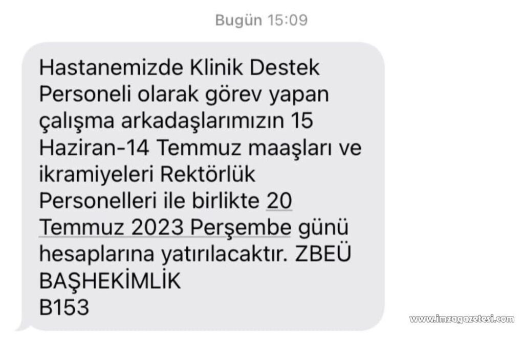 “Hastanemizde Sürekli İşçi olarak görev yapan çalışma arkadaşlarımızın 15 Haziran-14 Temmuz maaşları 15 Temmuz 2023 Cumartesi günü, ikramiyeleri ise ileri bir tarihte hesaplarına yatırılacaktır. ZBEÜ BAŞHEKİMLİK”