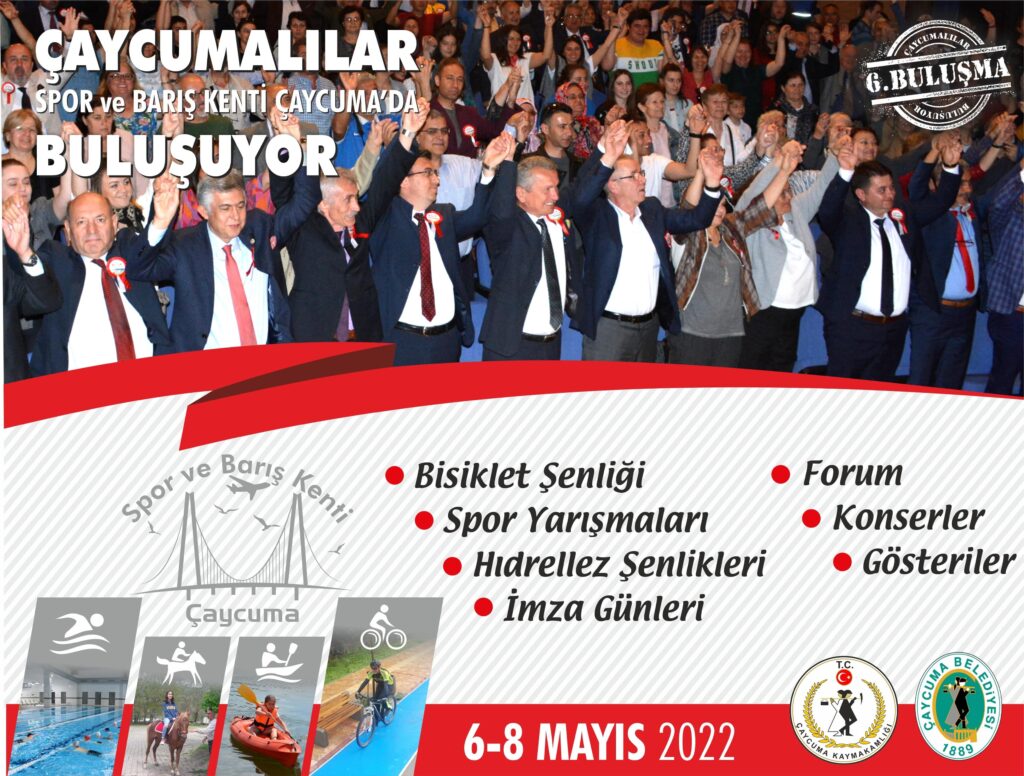 Çaycuma ilçesinde düzenlenecek olan "Çaycumalılar Buluşuyor” etkinliklerinin programı belli oldu. Pandemi nedeniyle iki yıldır yapılamayan ve bu yıl “Spor ve Barış Kenti Çaycuma” mottosuyla altıncısı gerçekleştirilecek buluşmaya, kent dışında yaşayan 500’e yakın Çaycumalı davet edildi. Üç güne yayılan ve içinde bisiklet, motosiklet ve uçurtma şenlikleri, konserler, paneller, forumlar, imza günleri gibi pek çok aktivitenin yer aldığı buluşmada, hıdrellez şenliği ve çok sayıda gösteri de yer alıyor.