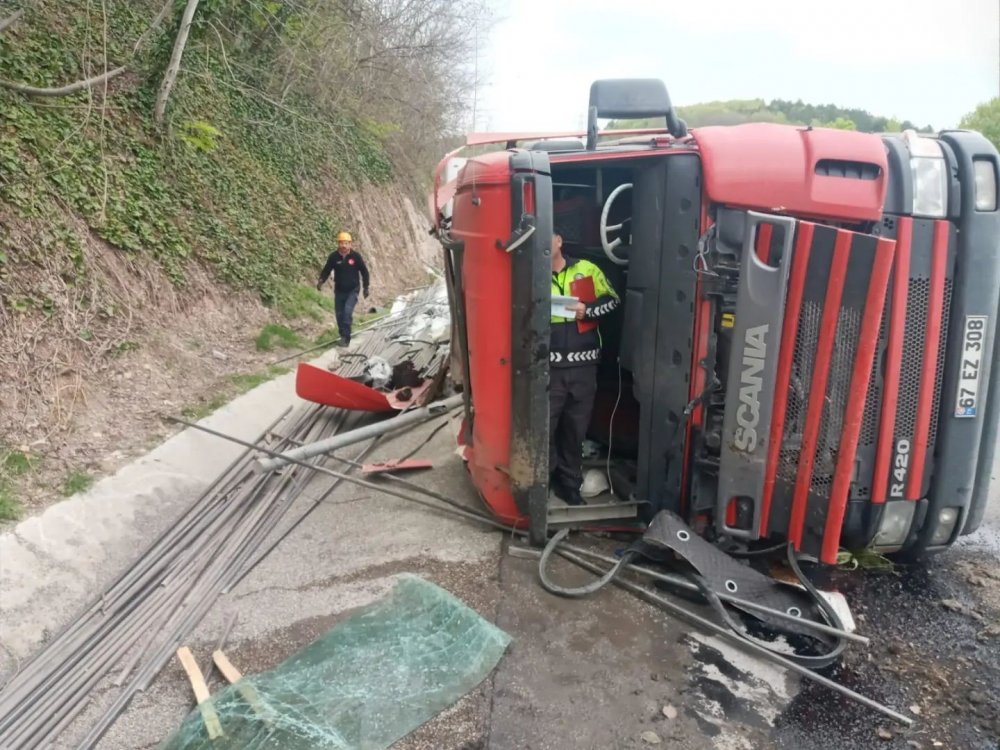 Zonguldak'ta demir yüklü tır kontrolden çıkarak devrildi. Kazada sürücü hayatını kaybetti.