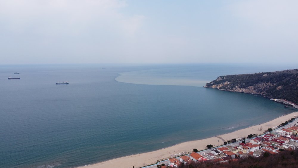 Geniş bir alanı kaplayan ve deniz yüzeyinin rengini değiştiren çamurlu sular dron ile görüntülendi.