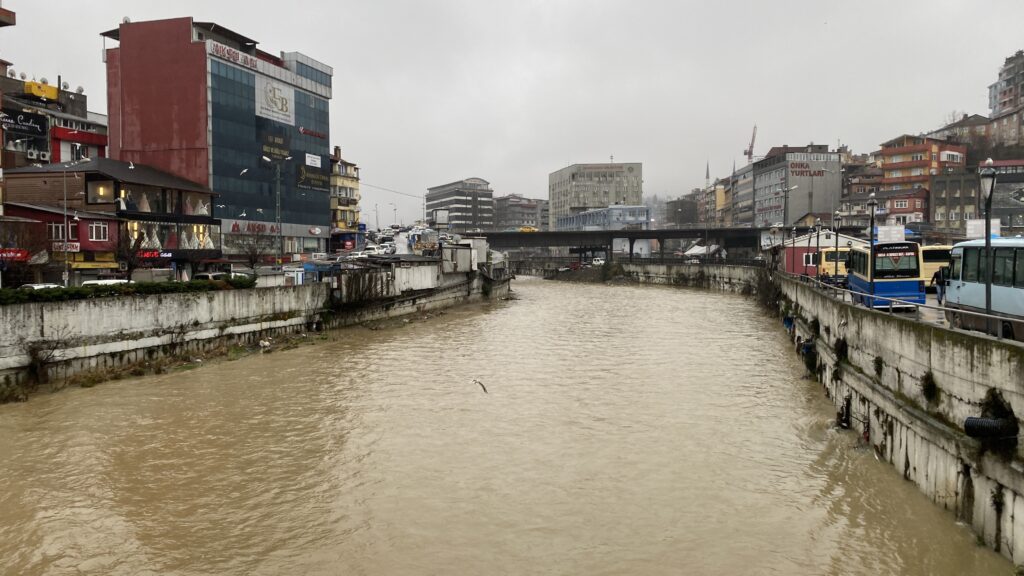 Zonguldak’ta iki gündür devam eden sağanak yağış nedeniyle kent merkezinde ki derelerin rengi sarıya döndü.