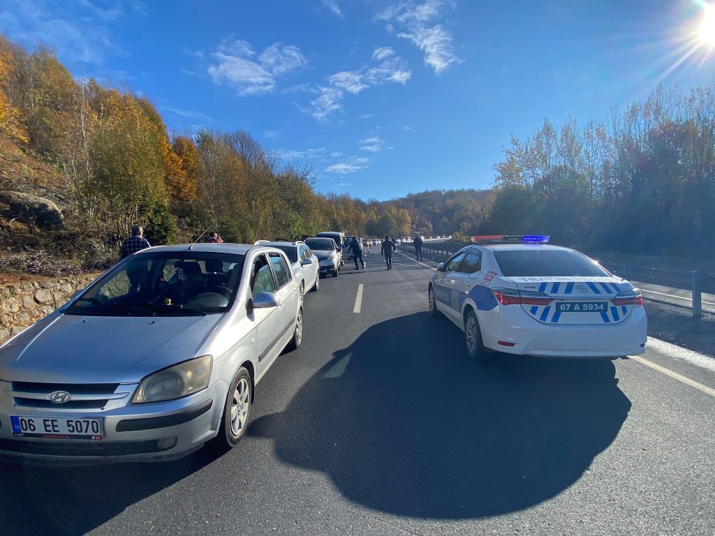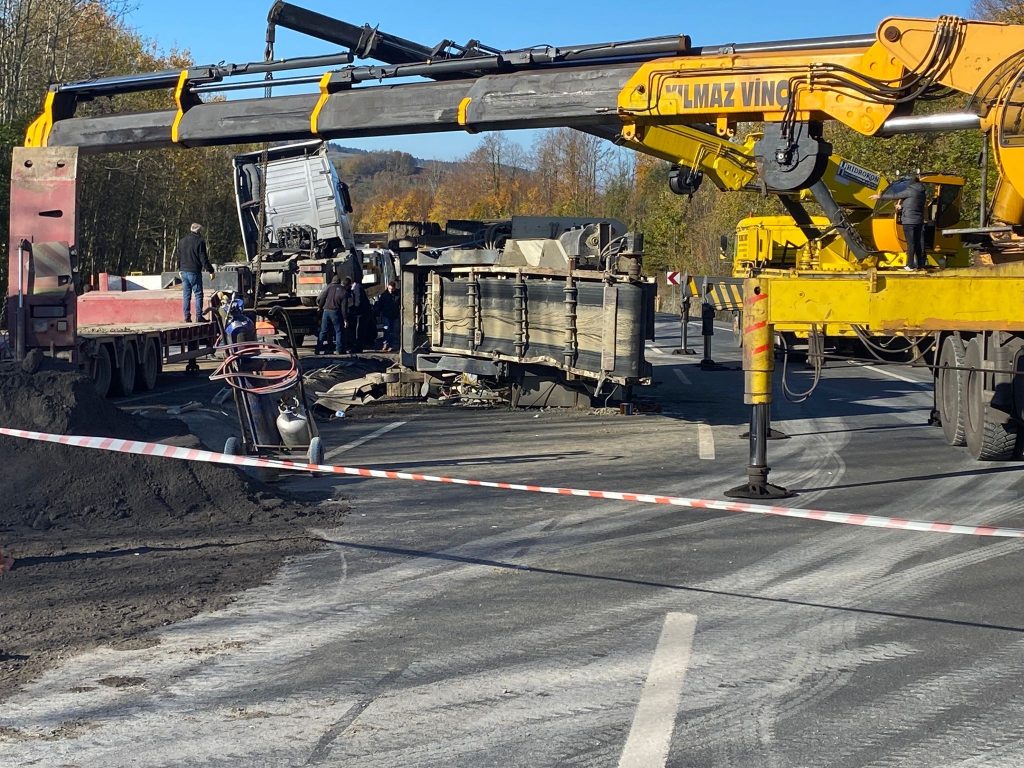 Zonguldak-İstanbul karayolunda iş makinesi taşıyan çekici tırın lastiğinin patlaması sonucu meydana gelen kaza sonrası olay yerine getirilen vinç; tırı bulunduğu yerden kaldırdı. Uzun kuyrukların oluştuğu kaza yerinde bir süre yol trafiğe kapatıldı.