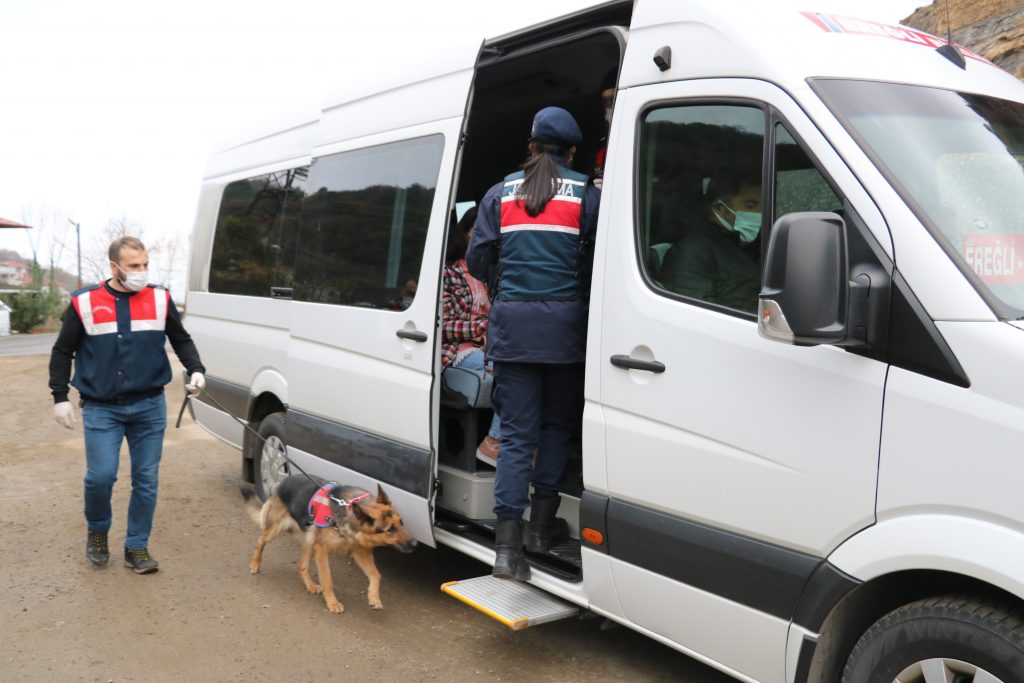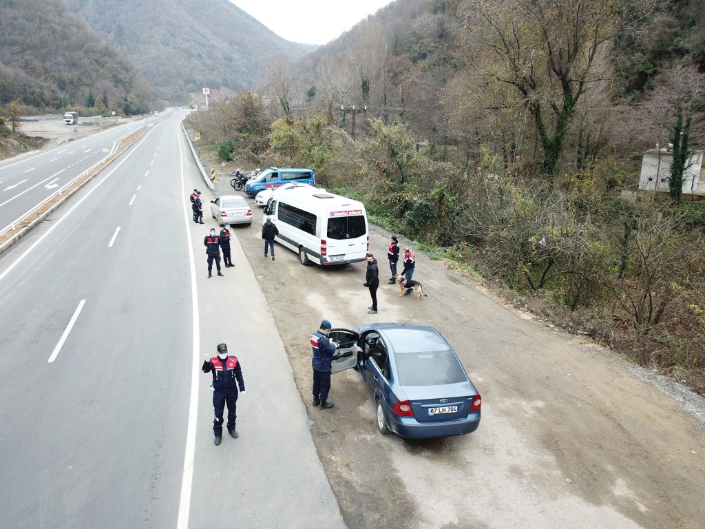 Yeni tip korona virüs salgını dolayısıyla Zonguldak'ta tedbirler kapsamında denetimler sıklıkla sürüyor. İl Jandarma Komutanlığı'na bağlı ekipler havadan ve karadan eş zamanlı trafik denetimi düzenlendi. Denetimde Hayat Eve Sığar (HES) uygulaması, maske denetimi, asayiş ve araç muayene gibi trafik kontrolü de gerçekleştirildi. Havadan drone ile kural ihlali yaptığı tespit edilen araçlar ekiplere bildirilirken Narkotik köpeği “Vera” araçları didik aradı. KOM ekipleri de uygulamada yer aldı.