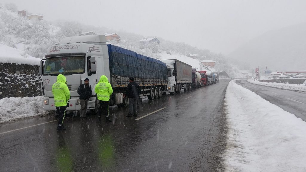 Zonguldak’ta devam eden yoğun kar yağışı etkisini sürdürüyor. Zonguldak-Ankara karayolunda yoğun kar yağışı nedeniyle tırların geçişine izin verilmedi. Yolun kenarında uzun kuyruk oluşturan ve yolun açılmasını bekleyen tır şoförlerine trafik ekipleri eşlik etti.