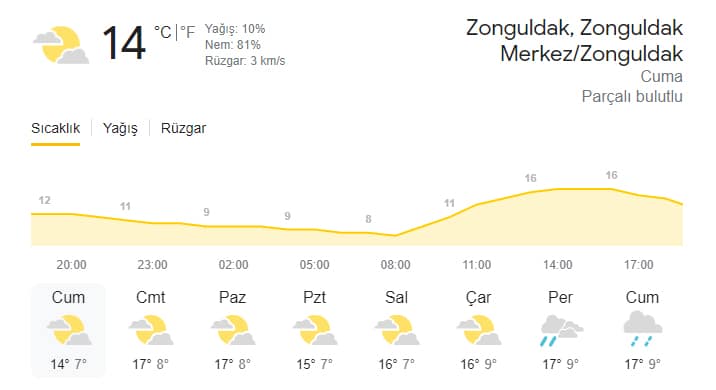 Zonguldak'ın bir haftalık hava durumu şu şekilde;