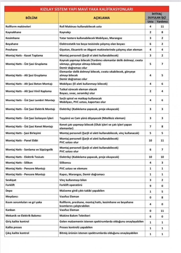 "Yaşadığımız deprem felaketinin ardından ortaya çıkan konaklama ihtiyacının acilen karşılanmasını teminen Malatya ilimizde kurulu KIZILAY KONTEYNER FABRİKASINDA asgari bir ay süreyle çalıştırılmak üzere tabloda nitelikleri ve sayısı belirtilen İşgücü ihtiyacı bulunmaktadır. Çalışacak personelin ücreti, konaklama ve yeme içme masrafı KIZILAY tarafından karşılanacaktır. Bu zor günlerde birlik ve beraberlik içerisinde hareket eden tüm sanayicilerimize ve hemşerilerimize canı gönülden teşekkür ederiz. MÜRACAAT : Zonguldak Sanayi ve Teknoloji İl Müdürlüğü-Serdar GÖRMÜŞ 05528602864"