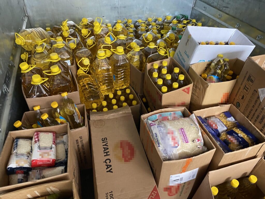 Şeker, sıvı yağ, çay, bakliyat çeşitleri gibi temel ihtiyaç malzemelerinin dışında temizlik ürünlerinin de yer aldığı depodaki malzemelere el konuldu. Kamyonlara yüklenen malzemeler belediyeye ait soğuk hava deposuna taşındı.