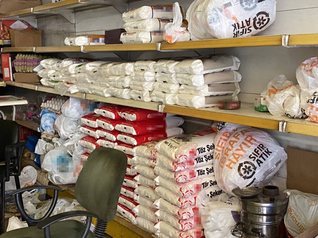 3 katlı metruk binanın daha önce bakkal olarak kullanılan giriş katı ve deposunda 20 ton gıda ürünü ve yüzlerce koli temizlik malzemesi ele geçirildi.