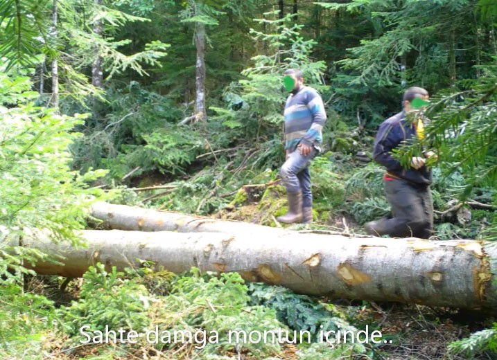 Bartın'da ormanda kaçak yolla kesilen ağaçlara sahte damga basan iki kişi fotokapana yakalandı. İki kişi hakkında başlatılan adli işlem sürüyor.