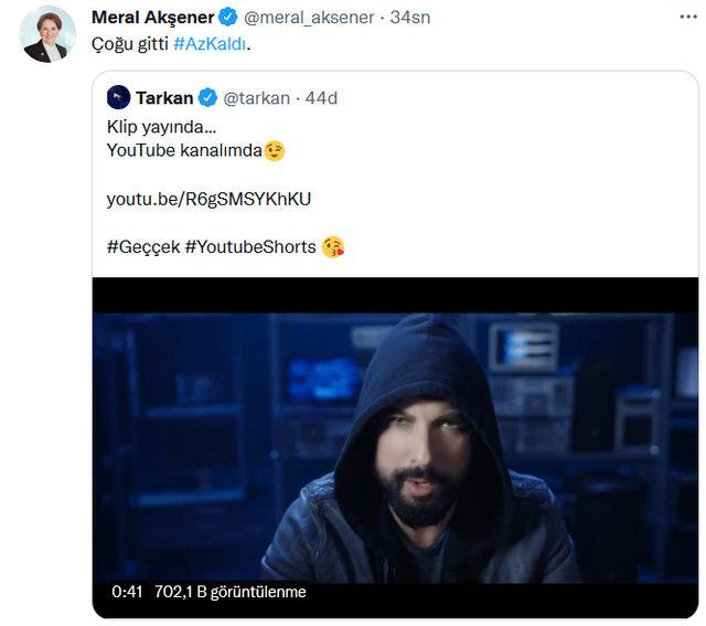 İyi Parti Genel Başkanı Meral Akşener, Tarkan'ın paylaşımını alıntılayarak Twitter hesabından paylaştı. Akşener paylaşımına "Çoğu gitti, az kaldı" notunu yazdı.