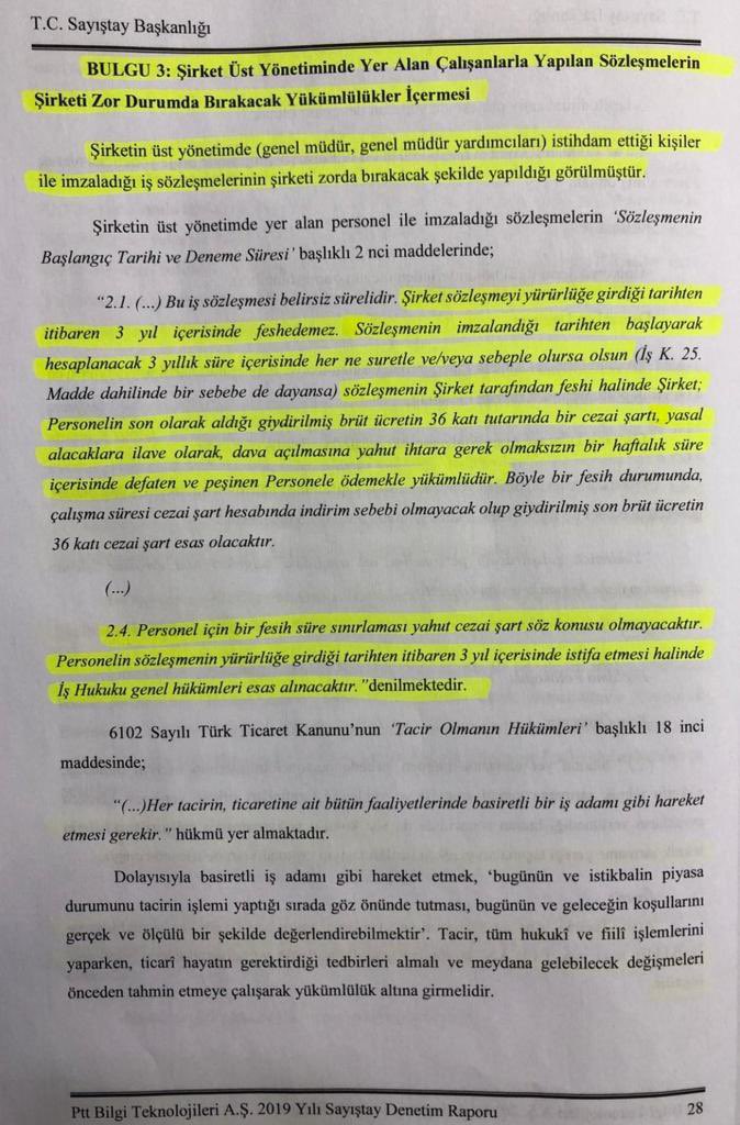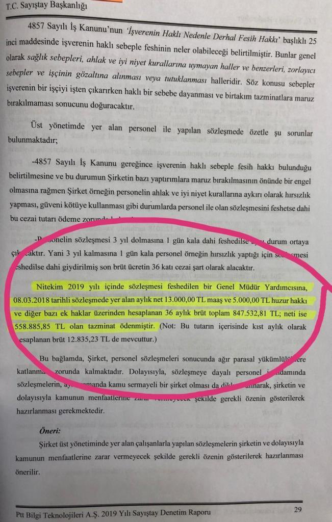 CHP Zonguldak Milletvekili Deniz Yavuzyılmaz, PTT'de 1 yıl çalıştıktan sonra sözleşmesinin feshedilerek 36 kat tazminat bedeli aldığını ortaya çıkardı. Sayıştay'ın 2019 raporunda PTT'de 1 genel müdürün aynı uygulama ile 36 kat tazminat aldığı ortaya çıkmıştı.
