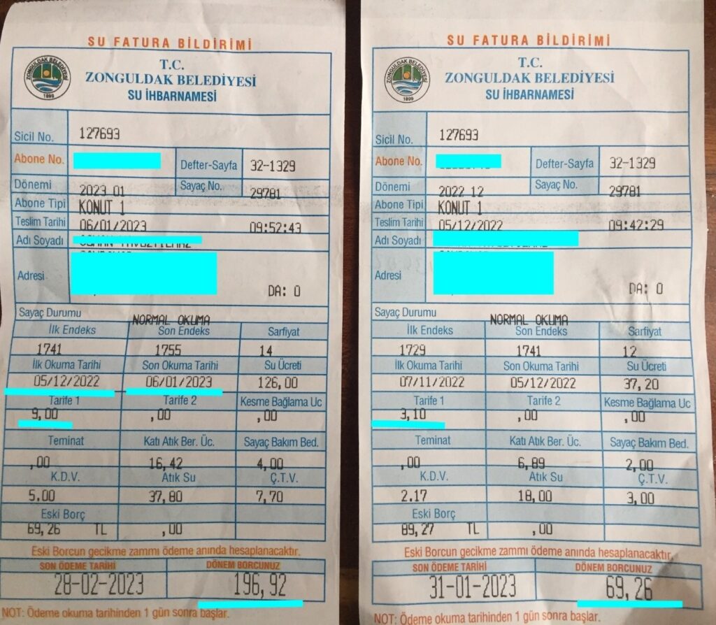 Alınan bilgilere göre haksız fatura gönderilen binlerce abonenin faturalarında güncelleme çalışmalarına başlayan Zonguldak Belediyesi, abonelerin faturalarındaki 2022 yılı Aralık ayına ait kullanımların metre küp fiyatını zamdan önceki fiyat olan 3.10 TL ye düşürürken, faturaların 2023 yılı Ocak ayına sarkan günlerini ise ayrıca faturalandırarak zamlı olan 9 TL üzerinden hesaplama yoluna gitti.