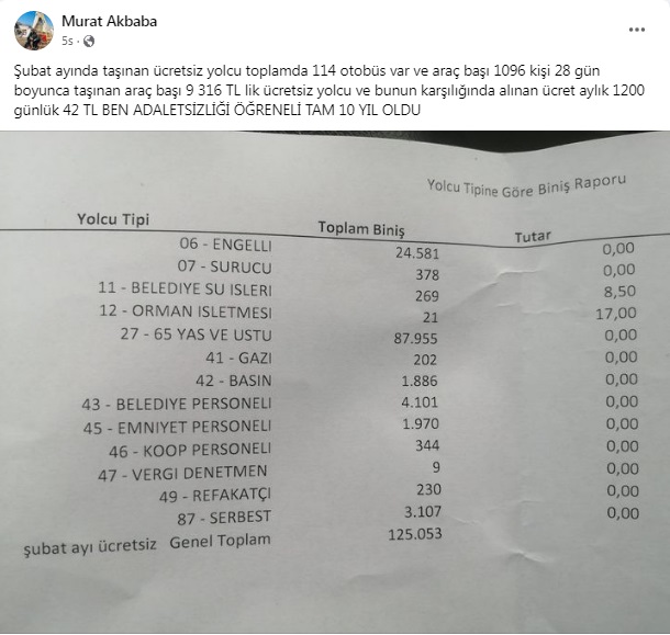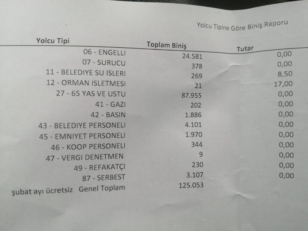 Kdz. Ereğli Çilek Halk Otobüsleri çalışanı Murat Akbaba sosyal medya hesabından 'Yolcu tipine göre biniş' raporunu paylaştı. Akbaba, taşınan ücretsiz yolcu karşılığı sürücü başına ödenen ücretin yetersiz olduğunu dile getirerek duruma isyan etti.