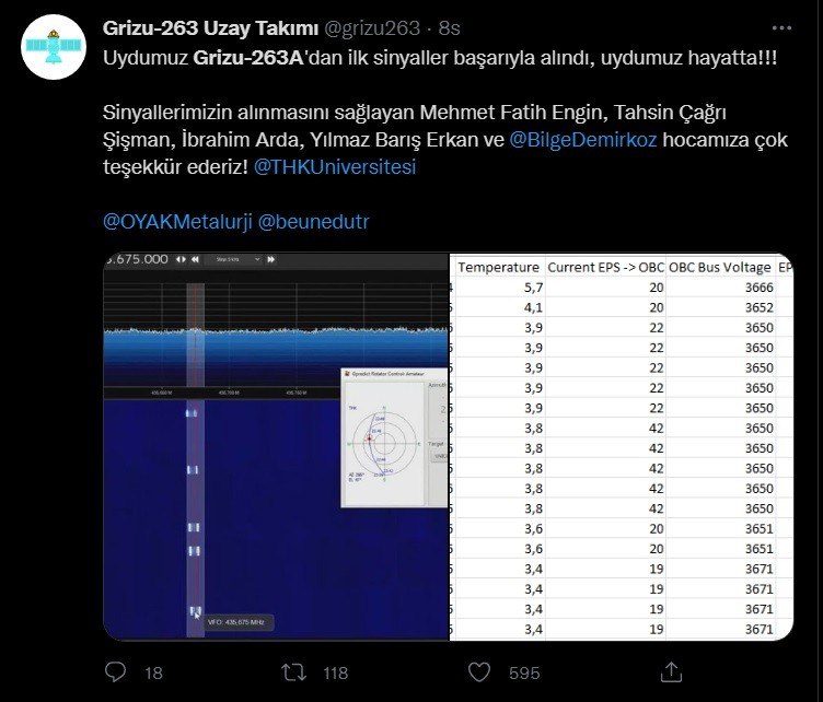"Uydumuz 'Grizu-263A'dan ilk sinyaller başarıyla alındı, uydumuz hayatta. Sinyallerimizin alınmasını sağlayan Mehmet Fatih Engin, Tahsin Çağrı Şişman, İbrahim Arda, Yılmaz Barış Erkan ve Bilge Demirköz hocamıza çok teşekkür ederiz."