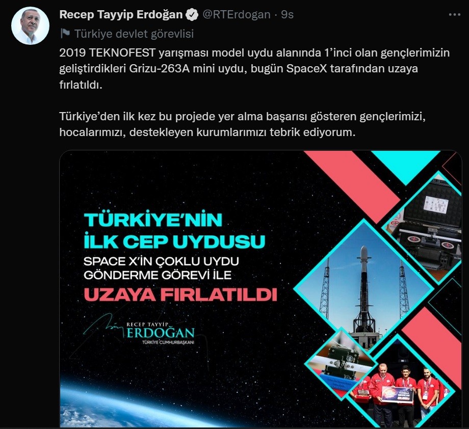 “2019 TEKNOFEST yarışması model uydu alanında 1’inci olan gençlerimizin geliştirdikleri Grizu-263A mini uydu, bugün SpaceX tarafından uzaya fırlatıldı. Türkiye’den ilk kez bu projede yer alma başarısı gösteren gençlerimizi, hocalarımızı, destekleyen kurumlarımızı tebrik ediyorum”
