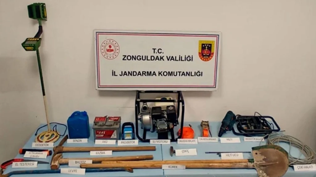 Zonguldak İl Jandarma Komutanlığı ekiplerince yapılan çalışmalar sonucunda, 16 Ağustos 2023 günü Kdz.Ereğli İlçesi mülki sınırları içerisinde icra edilen operasyonda; (6) şahıs kaçak kazı yaptığı esnada, (3) adet dedektör, (4) adet dedektör başlığı, (1) adet akü, (1) adet su tahliye motoru, (5) litre benzin, (1) adet hilti, (3) adet hilti ucu, (30) metre çeki halatı, (1) adet testere, (1) adet çekiç, (1) adet balyoz, (1) adet projektör, (1) adet kazma, (2) adet kürek ile birlikte suçüstü yakalandı.