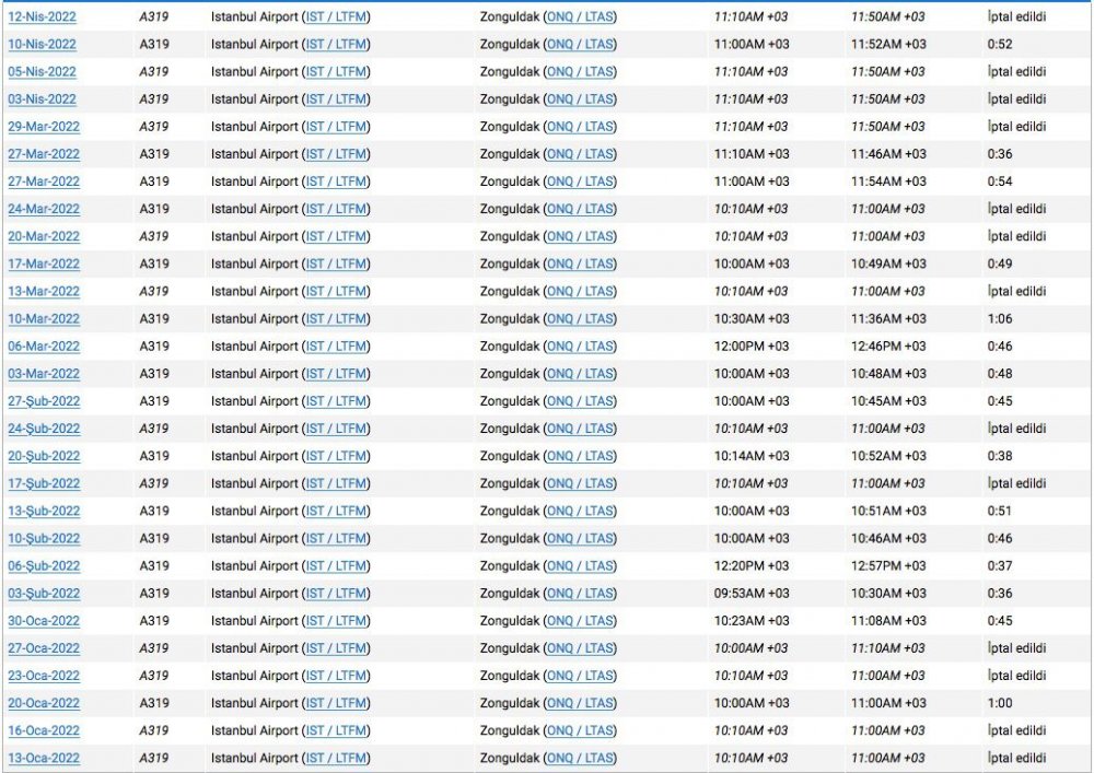 Uluslararası ticari uçuş takibi yapan dijital havacılık şirketi FlightAware vasıtasıyla yapmış olduğumuz incelemeler, Türk Hava Yollarının Zonguldak – İstanbul arasındaki karşılıklı seferlerinde ki yoğun iptal oranını ortaya koymaktadır.
