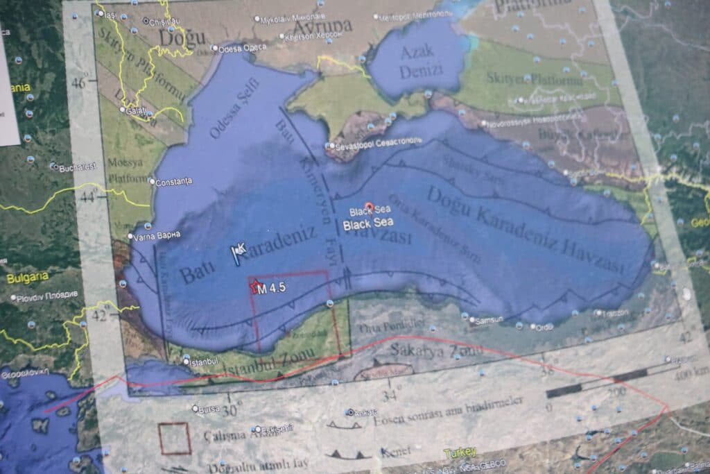 "Türkiye'deki fay hatları Afrika plakasının Avrupa plakasının Anadolu bloğunu yukarıya doğru itmesi nedeniyle oluşuyor. Kırmızı hattın yukarısı da ise görece olarak daha stabil olan Avrasya plakası var. Avrasya plakası stabil olduğu için Anadolu bloğu sıkışıyor. Hem katlanıyor katlanma nedeniyle düşey faylanmalar oluşuyor. Bir yandan da batıya doğru kaçma hareketi oluşuyor. Türkiye'de çok iyi bilinen doğrultu atımlı faylanmalar Kuzey Anadolu Fay Hattı oluşuyor. Anadolu'da adeta kırışan bir elbise gibi kat kat düşey yönlü faylanmalar da var. Burası yukarıya doğru giderken bir miktar da Karadeniz bölgesini yukarıya doğru burada bizim ölçtüğümüz hızlara göre yılda 1-2 milimetre yukarıya doğru itiyor. Kuzey Anadolu Fay Hattı'nın hızı 2-2,5 santimetre iken Karadeniz'deki hareketler 1-2 milimetre. Böylece Karadeniz çöküntü havzası oluşuyor. Fakat Karadeniz çöküntü havzası oluşurken yer kabuğu gevrek dediğimiz malzeme olduğu için yer yer kırıklar oluşmaya başlıyor. Dalma batma zonu oluşuyor. Deniz tabanı daha ağır olduğu için Karadeniz'de denizin içi karanın altına giriyor. Denize paralel sıra dağlar oluşuyor. Bir süre sonra bunlar malzeme yeniliyor, kırılmalar başlıyor. Bindirme zonu olduğu için düşey yönlü depremler oluşuyor. Karadeniz'in içerisinde bir çok yapı var. Türkiye'de sadece Kuzey Anadolu, Doğu Anadolu Fay Hattı konuşuluyor. Sanki diğer yerlerde deprem olmazmış düşüncesi var. Bu doğru değil. Kuzey Anadolu ve Doğu Anadolu Fayı daha hızlı hareket ettiği için daha çabuk stres biriktiriyor. Kırılma süreleri daha yeni o yüzden insanlar tarih kayıtlarında bu depremleri daha sık gördüğü için sanki sadece buralarda deprem varmış gibi. Hayır bunların hareketleri daha küçük olduğu için kırılma, büyük deprem üretme süreleri bin, bin 500 yıl gibi aralıklarla oluyor."
