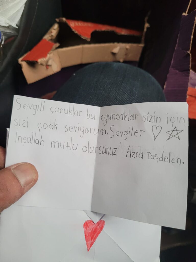 Edinilen bilgilere göre; Kdz. Ereğli'de ikamet eden Azra Taşdelen, geçtiğimiz Cumartesi gecesi depremin merkez üssü olan Kahramanmaraş'a giden Aşevi Yardım tırı ile kendi oyuncaklarını depremzede çocuklara gönderdi. Tır ile Kahramanmaraş'a götürülen yardımları dağıtan gönüllü ekip, bir oyuncak paketini açtığında Azra Taşdelen'in mektubuyla karşılaştı. Mektubu okuyan ekip üyeleri, duygusal anlar yaşadı. Oyuncakların, mektup ile birlikte depremzede çocuklara teslim edildiği öğrenilirken; depremzedelerin de kendilerine gönderilen yardımlardan dolayı Kdz. Ereğli halkına teşekkür ettikleri bildirildi.