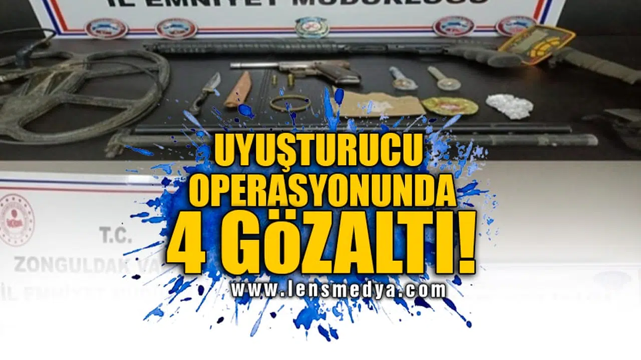 Zonguldak’ın Ereğli ilçesinde polis ekipleri tarafından gerçekleştirilen operasyonda 4 kişi gözaltına alınırken, bir miktar uyuşturucu, tarihi eser değerinde bilezik, tabanca ve mermileri ele geçirildi.