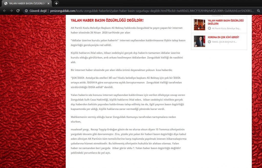 Kozlu Belediye Başkanı Ali Bektaş’ın Antalya’da otelleri olduğu iddiaları üzerine Lens Medya Haber’in yapmış olduğu haber yargıya intikal ederek karar verildi.