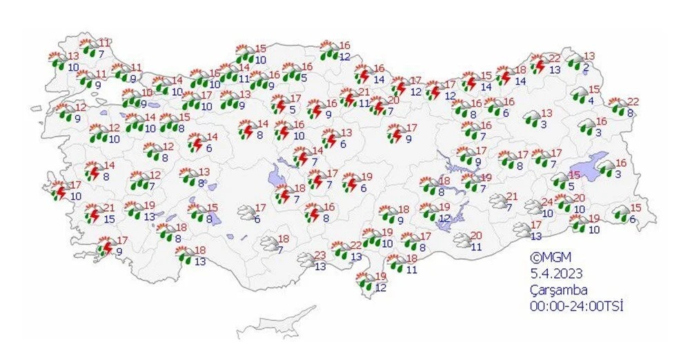 Meteoroloji Genel Müdürlüğü tarafından yapılan son değerlendirmelere göre: Ülke genelinin parçalı ve çok bulutlu, Marmara, Ege, Akdeniz, İç Anadolu, Karadeniz, Doğu Anadolu ile Gaziantep, Kilis, Adıyaman ve Siirt çevrelerinin yağmur ve sağanak, yer yer gök gürültülü sağanak yağışlı geçeceği tahmin ediliyor.
