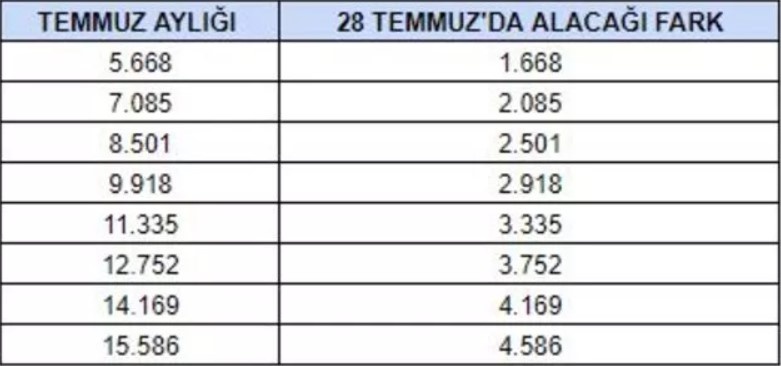Zam farkları, temmuzun 1'i ile 5'i arasında emekli aylıklarını zamsız alan tüm memur emeklileri ile hak sahiplerine ödenecek. Temmuz başında örneğin 5 bin lira zamsız emekli aylığı alan bir memur emeklisinin hesabına 2 bin 85 lira zam farkı yatırılacak.
