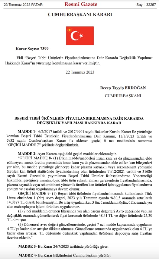 Beşeri Tıbbi Ürünlerin Fiyatlandırılmasına Dair Kararda Değişiklik Yapılması Hakkında Karar Resmi Gazete’de yayımlandı. Böylelikle 1 euro değeri 2023 Temmuz ayında yüzde 30,5 oranında artırılarak 14,0387 TL olarak belirlendi.