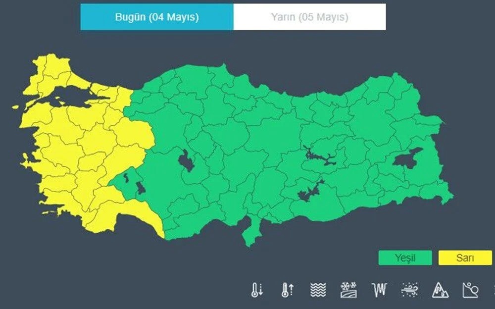 Afyonkarahisar, Antalya, Aydın, Balıkesir, Bilecik, Burdur, Bursa, Çanakkale, Denizli, Edirne, Eskişehir, İstanbul, İzmir, Kırklareli, Kocaeli, Kütahya, Manisa, Muğla, Sakarya, Tekirdağ, Uşak ve Yalova'da ani sel, su baskını, yıldırım, yerel dolu yağışı ve kuvvetli rüzgar gibi olumsuzluklara karşı dikkatli ve tedbirli olunması istendi.