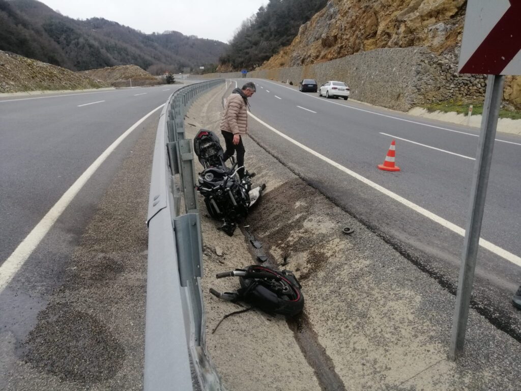 Kaza, Zonguldak Ereğli yolu arasında meydana geldi. Edinilen bilgilere göre, hızlı gittiği iddia edilen motor sürücüsü virajı alamayarak bariyerlere çarptı. Çarpmanın etkisiyle motor parçalara ayrılırken sürücü ve yanında bulunan arkadaşı yola savruldu. Olayı gören diğer sürücüler 112 Acil Servisi arayarak yardım istedi. Sağlık ekiplerinin ilk müdahalesinin ardından ağır yaralanan 2 kişi, Bülent Ecevit Üniversitesi Uygulama ve Araştırma Hastanesi kaldırıldı.
