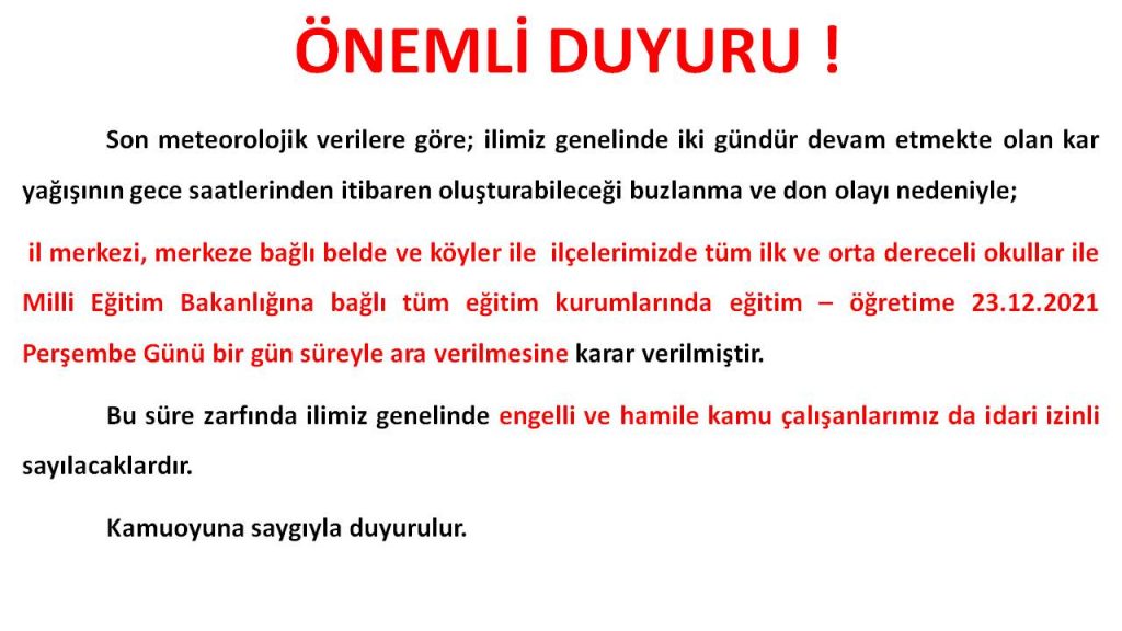 Zonguldak Valiliği tarafından yapılan açıklamaya göre 23.12.2021 tarihinde yoğun kar yağışı nedeniyle tüm ilde okullar tatil edildi.