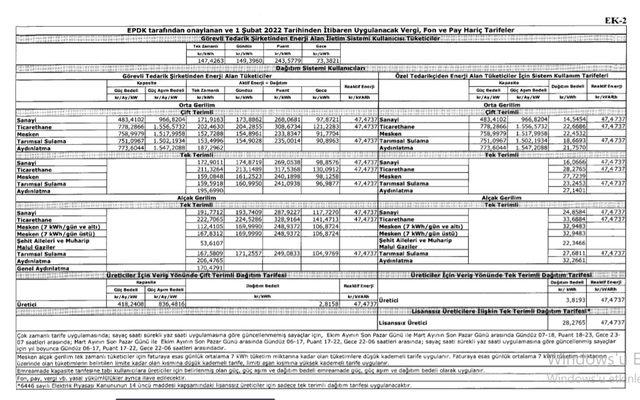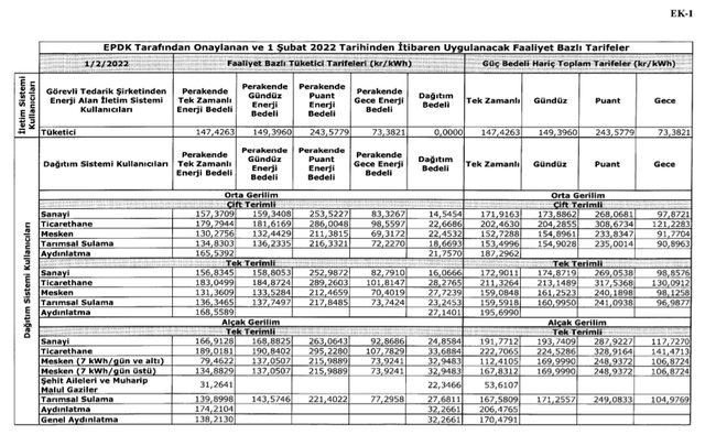 Enerji Piyasası Düzenleme Kurulu’na ilişkin kurul kararı Resmi Gazete’nin bugünkü sayısında yayımlandı. Buna göre, Enerji Piyasa Düzenleme Kurulunun 31/01/2022 tarihli toplantısında;31/12/2021 tarihli ve 10707 sayılı Kurul Kararı ile mesken alçak gerilim tek zamanlı abone grubu için faturaya esas günlük ortalama 5 kWh olarak belirlenen tüketim miktarının, 1/02/2022 tarihinden itibaren düzenlenecek faturalar için günlük ortalama 7 kWh olarak güncellenmesine karar verildiği belirtildi.