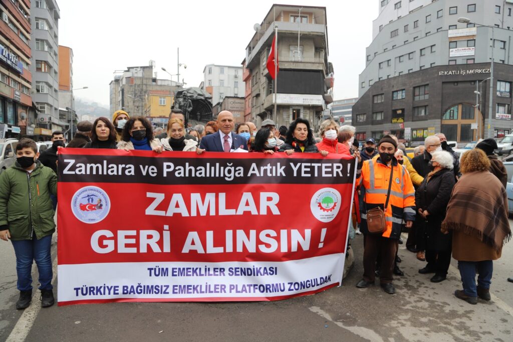 Tüm Emekliler Sendikası Türkiye Bağımsız Emekliler Platformu Zonguldak şubesi üyeleri Madenci Anıtı’nda basın açıklaması düzenleyerek emekliye yapılan düşük zamları protesto etti.