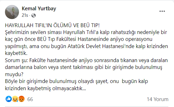 Zonguldak’ın sevilen simalarından Hayrullah Tıfıl’ın ölümü bir çok kişiyi yasa boğarken, uzun yıllar Zonguldak’ta Kulak-Burun- Boğaz uzmanı olarak doktorluk yapan Kemal Yurtbay’ın sosyal medya hesabından yapmış olduğu açıklama kafaları karıştırdı. Zonguldak’ta yaklaşık 40 yıl doktorluk yapan Yurtbay Bülent Ecevit Üniversitesi Uygulama ve Araştırma Hastanesini işaret ederek şok bir açıklama yaptı.