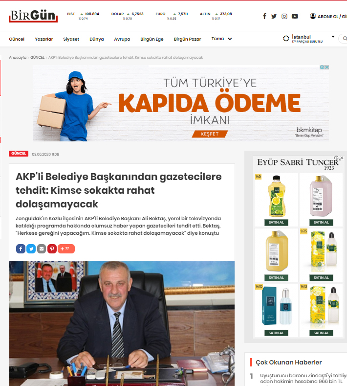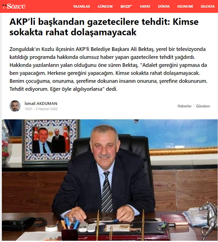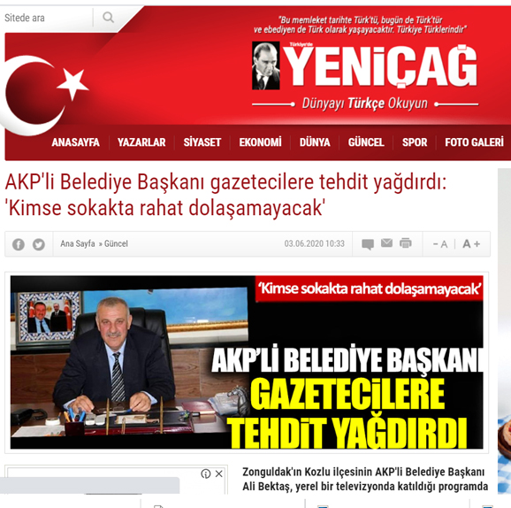 Kozlu Belediye Başkanı Ali Bektaş geçtiğimiz gün bir TV programında kendisi ile ilgili olumsuz haber yapan gazetecileri canlı yayında tehdit etmesi üzerine Ulusal Basın duruma geniş yer ayırdı.