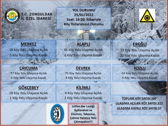 İl genelinde yaşanan yoğun kar yağışının ardından karla mücadele çalışmaları da sürüyor. Saat 16.30 itibariyle Merkezde 18 köy ulaşıma açılırken 5 köy için yol açma çalışmaları sürüyor. Alaplı ilçesinde 46 yol ulaşıma açılırken 6 köy için yol açma çalışmaları sürüyor. Kdz. Ereğli ilçesinde de 73 köy yolu ulaşıma açıldı. 20 köy yolunu ulaşıma açma çalışmaları sürüyor. Çaycuma ilçesinde ise 77 köy yolu ulaşıma açıldı. 6 köy yolunu açmak için çalışmalar sürüyor. Devrek ilçesinde 75 köy yolu ulaşıma açıldı. 8 köy yolunu ulaşıma açmak için çalışmalar sürüyor. Kozlu ilçesinde 14 köy yolu ulaşıma açıldı. 9 köy yolunu ulaşıma açmak için çalışmalar sürüyor. Gökçebey ilçesinde 18 köy yolu ulaşıma açıldı. 1 köy yolunu ulaşıma açmak için çalışmalar devam ediyor. Kilimli ilçesinde 4 köy yolu yapılan karla mücadele çalışmaları sonucunda ulaşıma açıldı. 2 köy yolunu ulaşıma açmak için çalışmalar devam ediyor.