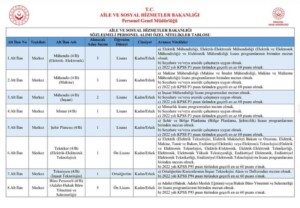 Aile ve Sosyal Hizmetler Bakanlığı Merkez ve Taşra Teşkilatında görev yapmak üzere 8000 personel alınacağını duyurdu. İşçi alımında aranan nitelik tablosu ise şu şekilde;