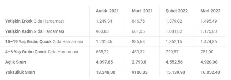 Türkiye İşçi Sendikaları Konfederasyonu (Türk-İş), 2022 Mart ayına ilişkin açlık ve yoksulluk sınırı verisini açıkladı.