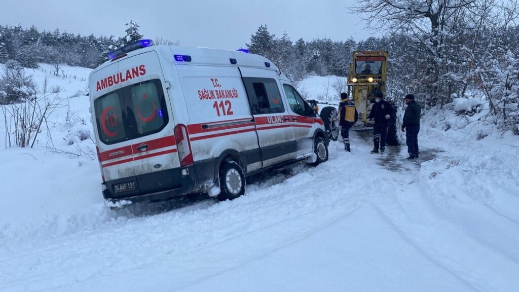 Bartın’ın Ulus ilçesinde hasta almaya giderken kar ve tipi nedeniyle yolda kalan ambulans, İl Özel İdaresi ekiplerinin yardımıyla kurtarıldı.