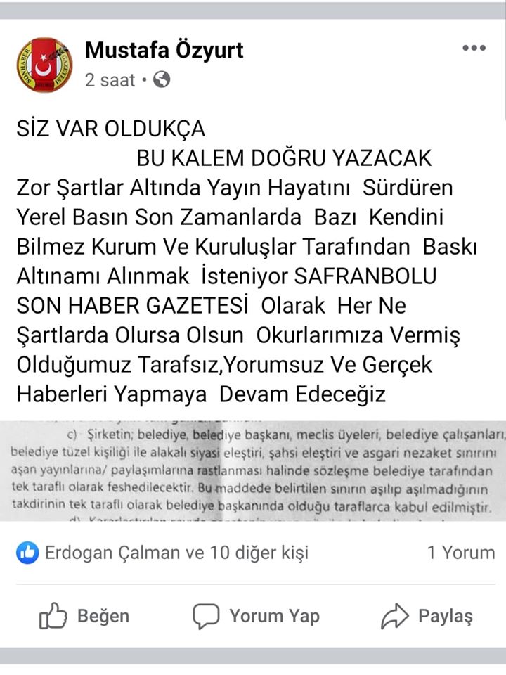 "Karabük ve Safranbolu'nun onurlu basını, "Ne hallere düştük. Bizi köle gibi gören densiz bize nasıl bir sözleşme hazırlamış diye asla üzülme, konuya el attık. Tükürdüğünü yalatmak boynumuzun borcudur. Mevkisi, makamı, cüssesi ne olursa olsun, hiç kimse Belediyenin, yani kamunun parası ile özgür basına sansür getiremez.