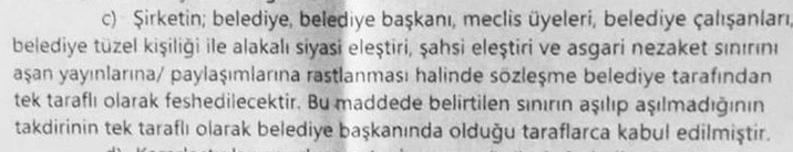 Anayasanın 28 maddesinde bulunan "Basın hürdür, sansür edilemez” bendine aykırı şekilde hazırlanan sözleşmeye göre bir basın kuruluşu Belediye başkanı, meclis üyeleri ve çalışanları hakkında aleyhinde eleştiri veya haber yaptığı takdirde sözleşme tek taraflı olarak fes edilebilecek.
